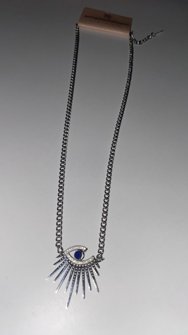 Uzun zincir detaylı, mavi göz desenli bohem tarzda kolye. Günlük kullanım için uygun, sade ve şık bir aksesuar.