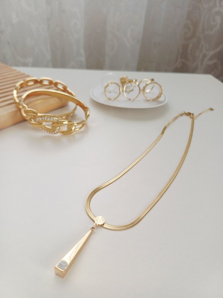 Uzun uzunlukta, zincir detaylı ve minimalist tasarımlı altın kolye, günlük kullanımda klasik şıklık sağlar. ✨