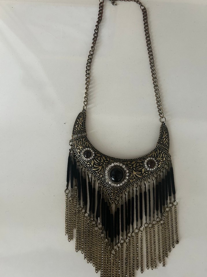 Günlük kullanıma uygun, uzun zincir detaylı ve işlemeli desenlere sahip siyah bohem tarzda kadın kolye, püskül detaylarıyla tamamlanmıştır.