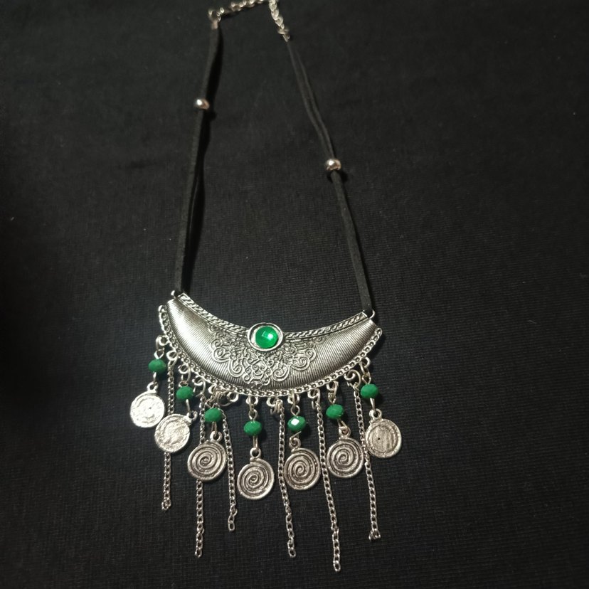 Uzun zincir detaylı, yeşil boncuklu ve işlemeli desenli bohem kolye, günlük kullanım için uygundur.