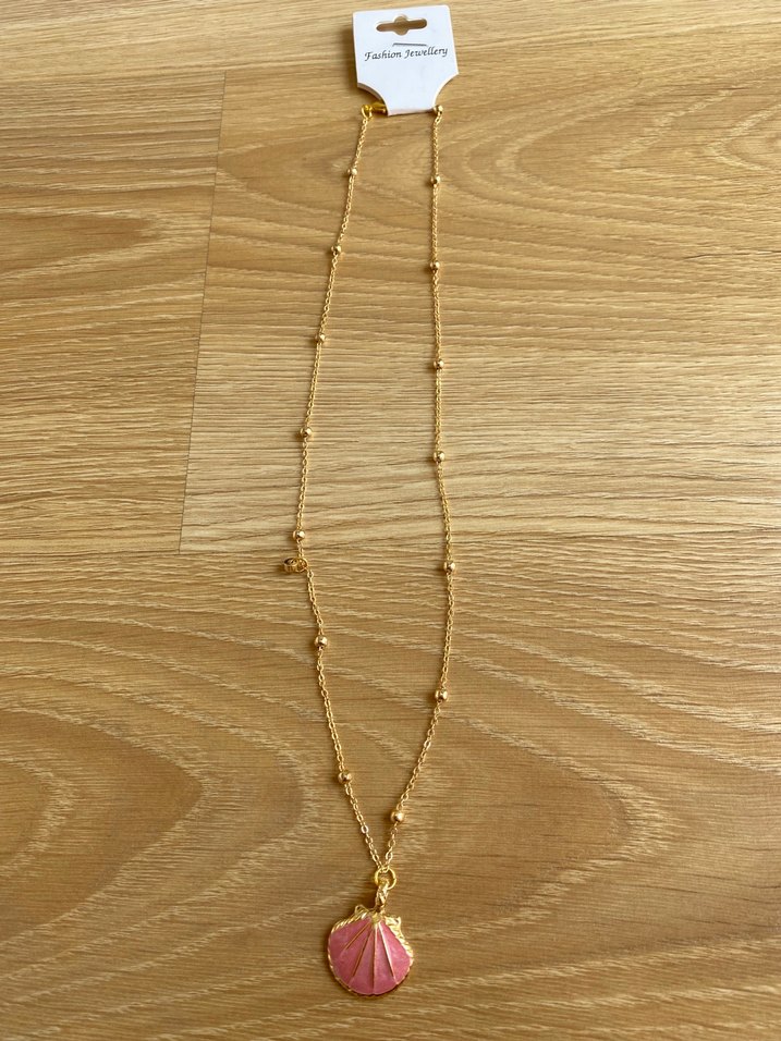 Detaylı zincir ve parlak pembe kabuk uçlu uzun altın renk kolye, yılan desenli. Bohem ve minimalist tarzda, günlük kullanım için uygundur.