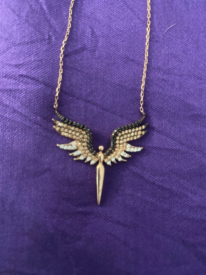 Uzun zincirli, altın renkli kanatlı kolye, koyu ve boncuk detaylarla süslenmiş. Gotik ve gösterişli tarzda, günlük kullanıma uygun. ✨