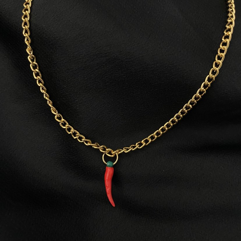 Uzun altın renk zincir detaylı, kırmızı biber uçlu kolye, cesur grunge punk tarzı için romantik akşamlarınızda şık bir seçim. ️