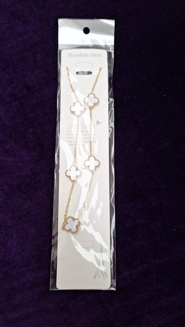 Uzun zincirli, altın renkli bu kolye, üzeri baskılı dört yapraklı yonca desenleriyle sade ve modern bir görünüm sunar.