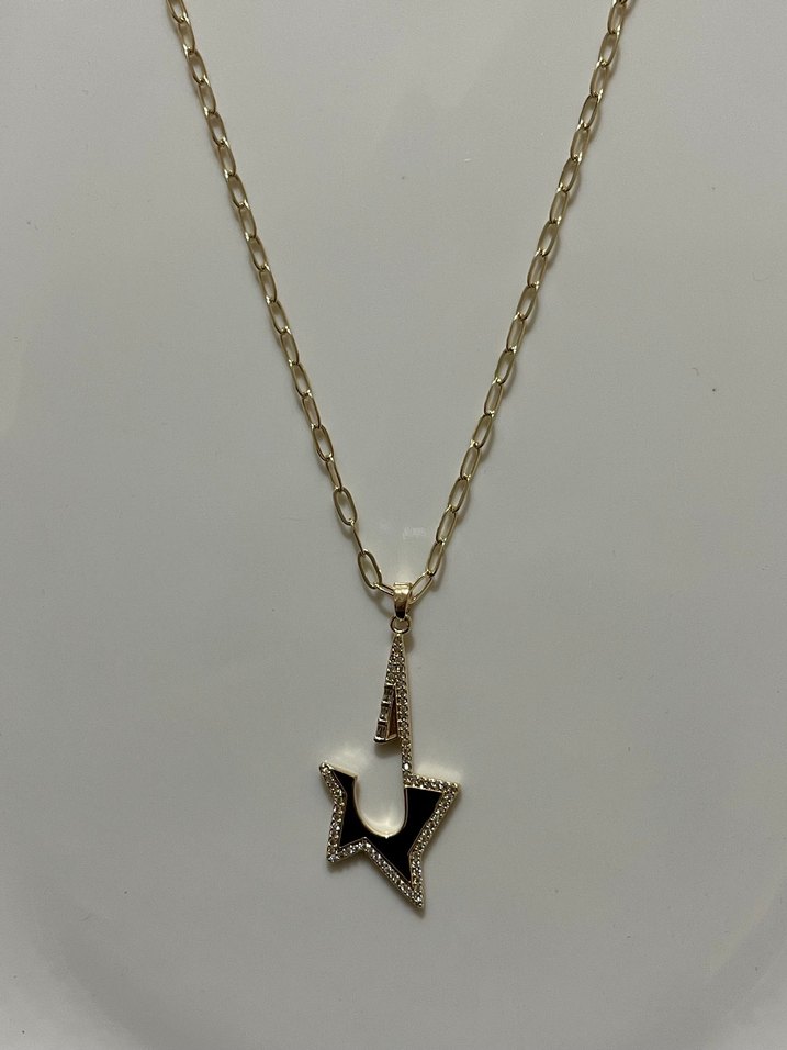 Uzun altın renk zincir ve detaylı kenarlara sahip koyu renk yıldız figürlü kolye, cesur ve çağdaş Paris tarzını yansıtır. ⭐