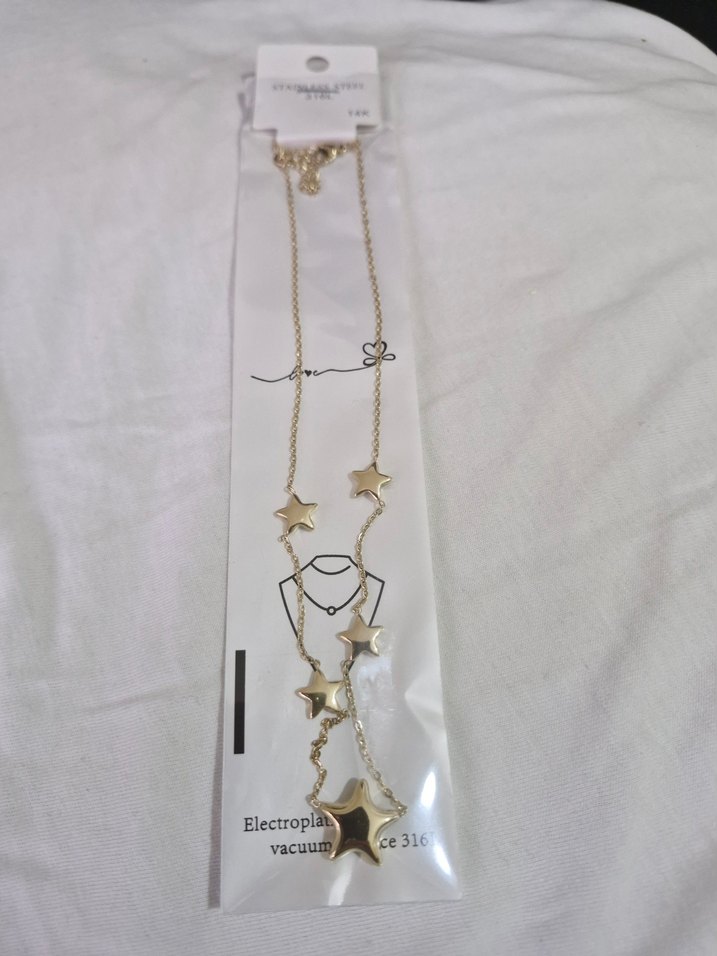 Uzun zincirli, altın renkli, nakışlı yıldız detaylı kadın kolyesi. Minimalist ve çağdaş tarzda, günlük kullanıma uygundur. Elektro kaplamalıdır. ✨