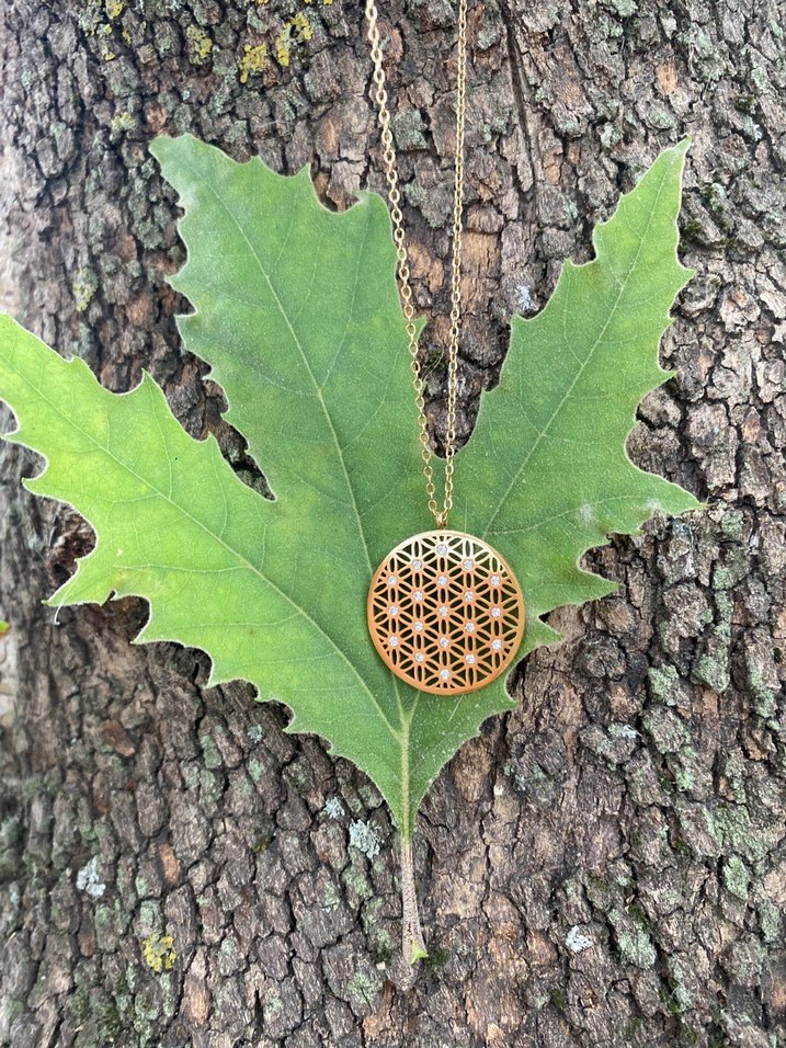 Uzun zincirli, altın renkli ve işlemeli desene sahip bohem tarzda kadın kolyesi.