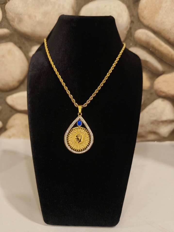 Uzun zincirli, altın renkli kolye, damla şeklinde yılan deseni ve mavi detaylı kolye ucu ile sade tarzı yansıtır.