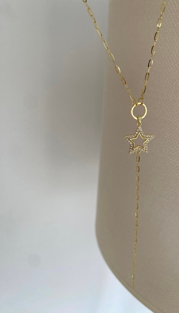 Uzun zincirli, detaylı altın renkli zincir ve parlak yıldız figürlü kolye, günlük kullanıma uygun minimalist tarzda. ✨
