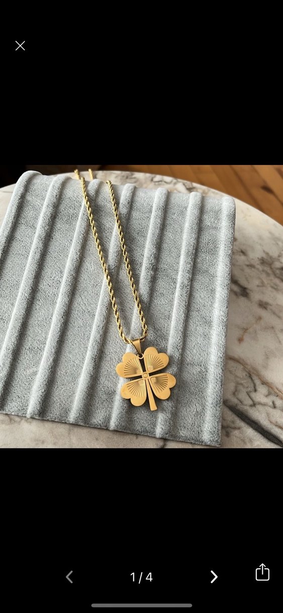 Uzun altın zincirli, işlemeli yonca figürlü kolye. Minimalist ve sokak stili için günlük kullanıma uygun.