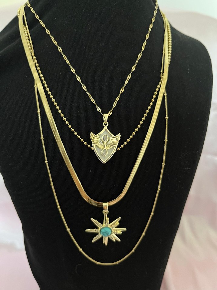 Bohem tarzda, detaylı zincirli uzun altın kolyeler. Güneş ve kalkan figürlü tasarımlar, günlük kullanım için uygun.