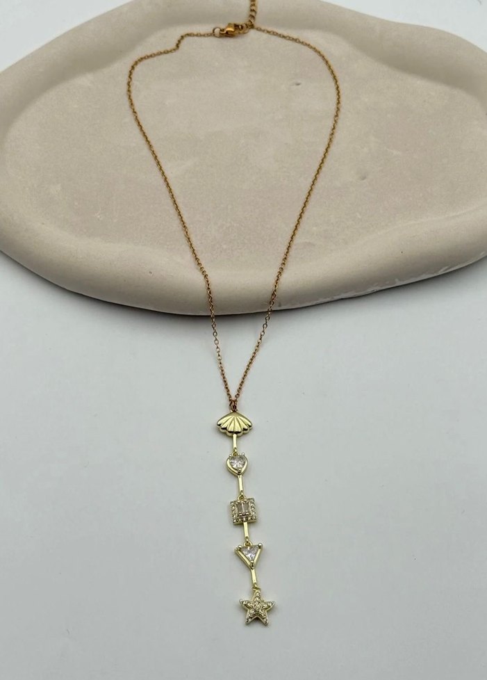 Uzun zincirli, altın renginde ve bohem tarzda detaylı zincirli kolye. Minimalist tasarımı günlük kullanıma uygundur.