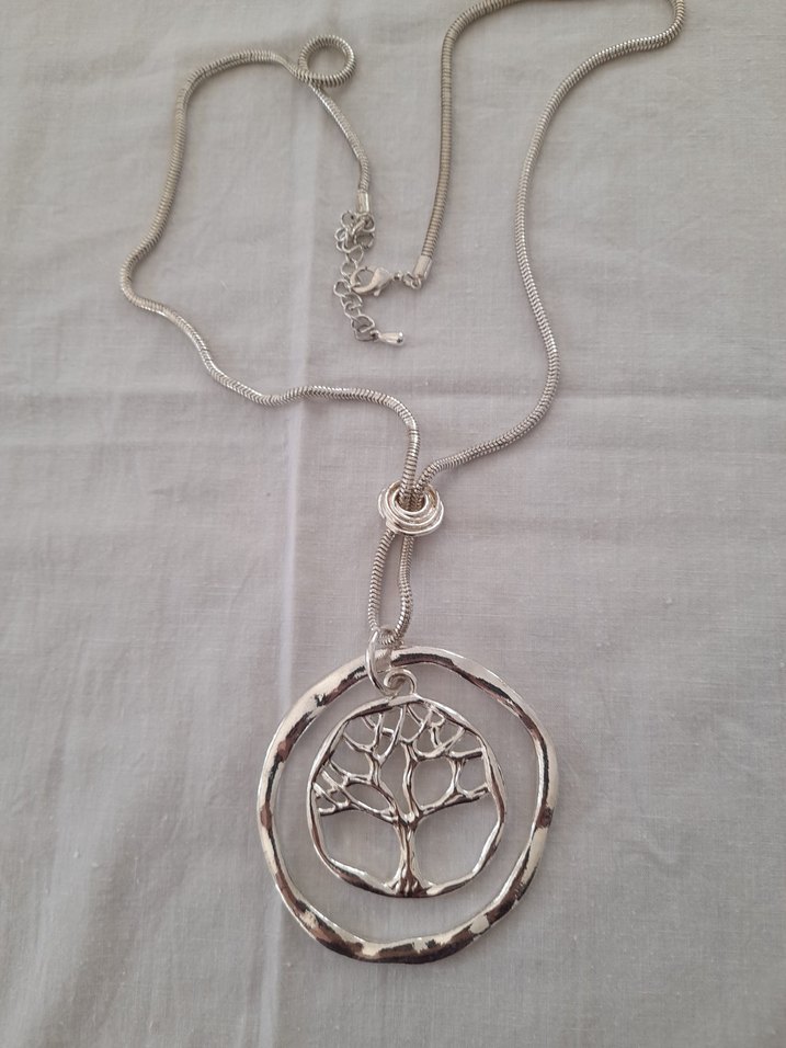 Uzun zincirli, detaylı zincir ve nakış desenli hayat ağacı figürlü gümüş rengi kadın kolye
