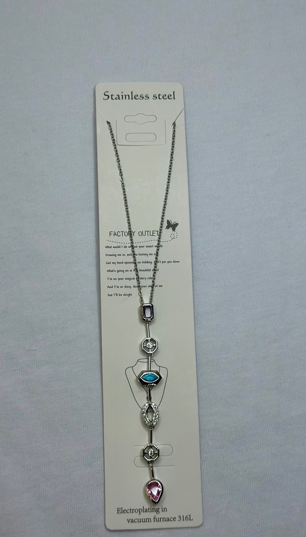 Uzun boyda, gri zincirli ve turkuaz baskılı detaylara sahip kadın kolyesi. Paslanmaz çelikten üretilmiş, bohem ve retro tarzına uygun, günlük kullanım için ideal.