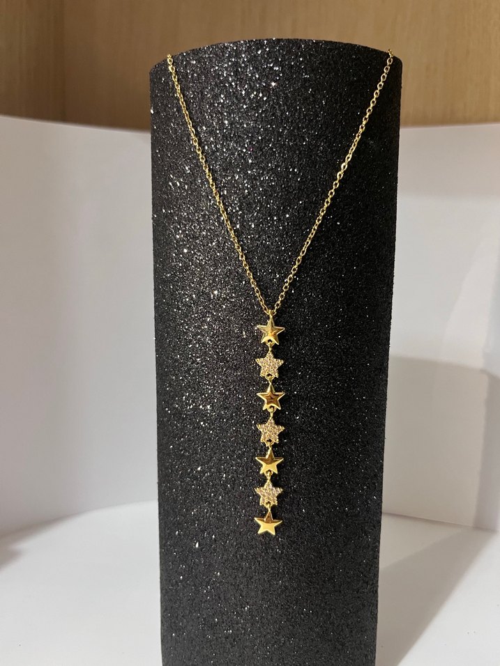 Uzun zincirli, altın renkli bu kolye, parlak yıldız detaylarıyla cesur ve gösterişli görünümler için uygundur. ✨