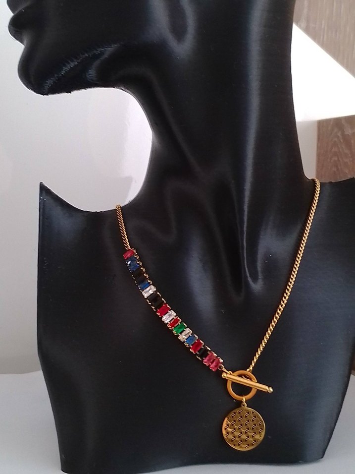 Uzun zincirli, çok renkli taşlar ve yuvarlak kolye ucu ile bohem tarzda kadın kolyesi. Kararmaz Paslanmaz Çelik takı. iade Yoktur.