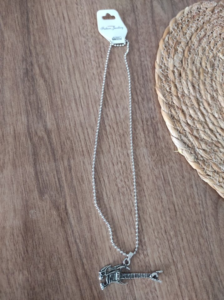 Uzun zincirli, gitar figürlü unisex kolye, rock punk ve bohem tarzını yansıtır. Günlük kullanım için uygundur.