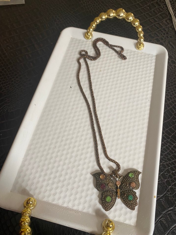 Uzun zincirli bu altın renkli kolye, renkli taşlarla süslenmiş kelebek figürü ve yılan deseni ile bohem tarzını yansıtıyor.