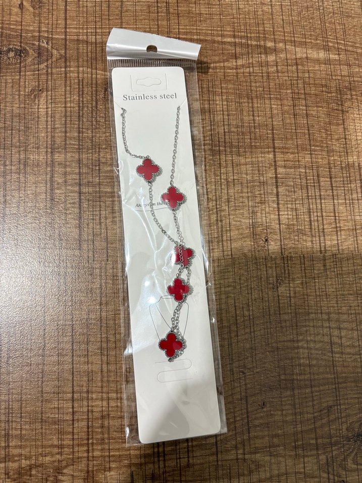 Uzun zincirli, kırmızı baskılı yonca detaylı kolye. Paslanmaz çelikten üretilmiş, renkli ve minimal bohem tarzda, günlük kullanıma uygun.