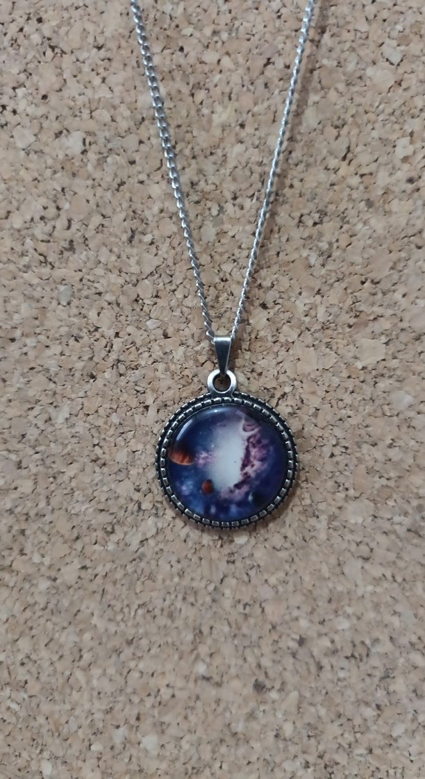 Detaylı gri zincir üzerinde mor tie-dye desenli uzun kolye, günlük kullanım için minimalist goth tarzına uygundur.