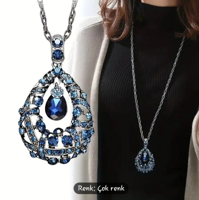 Uzun zincirli, desenli ve koyu mavi taşlarla süslü detaylı zincir kolye, günlük şıklık için uygundur.