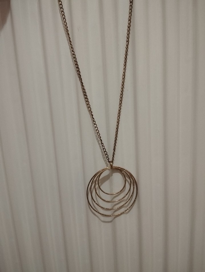 Uzun uzunlukta, detaylı zincirli altın renkli, desen içermeyen halka şeklinde minimalist kolye, günlük kullanım için uygundur.