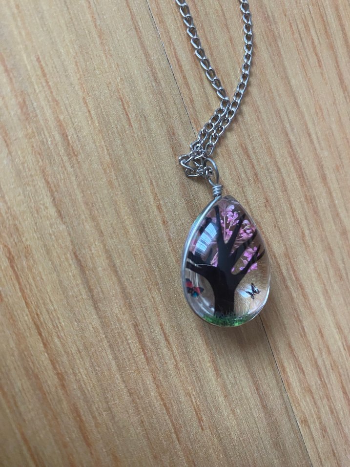 Uzun zincirli, detaylı zincir ve mor renkli ağaç desenli renkli kolye, bohem ve retro tarzları yansıtıyor.