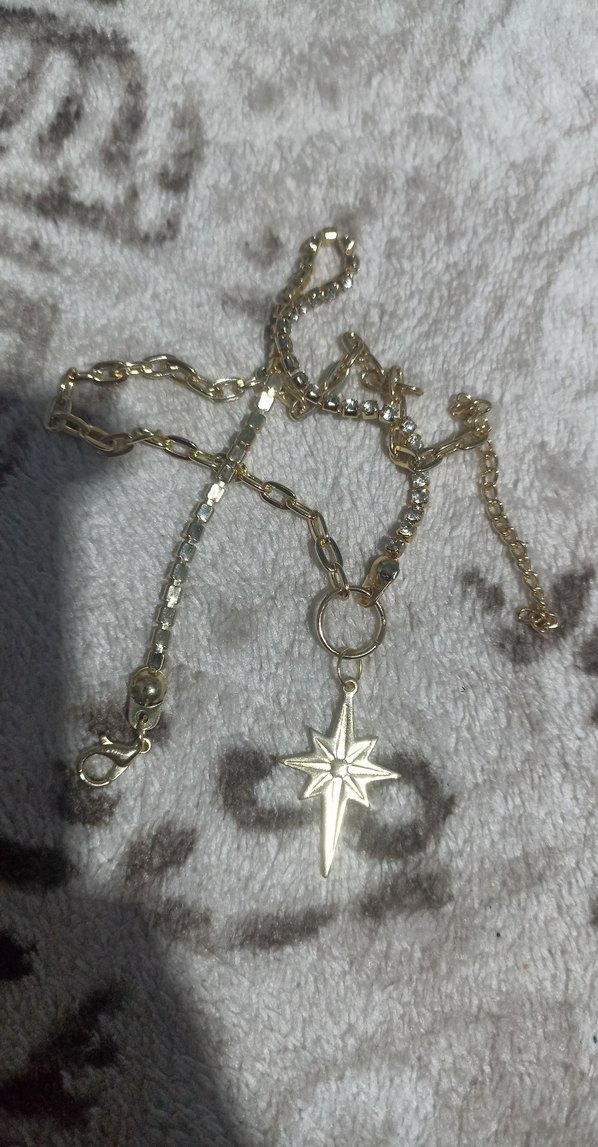 Parlak zinciri ve yıldız şeklinde kolyesiyle uzun, altın renkli kadın kolyesi, günlük kullanıma uygun bohem ve retro tarzda. ✨