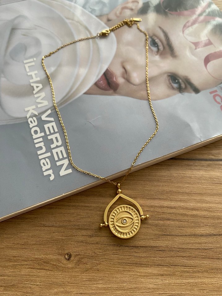 Parlak zincir detaylı uzun altın kolye, bohem tarzda göz figürlü baskılı tasarıma sahip. Günlük kullanıma uygun şık bir aksesuar. ✨