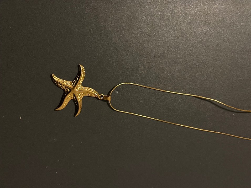 Parlak altın uzun zincirli, ve denizyıldızı figürlü vintage bohem kadın kolye.