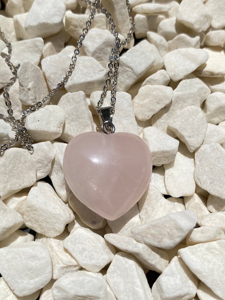 Uzun zincirli, pastel pembe kuvars kalp şeklinde kolye, bohem tarz için uygundur.