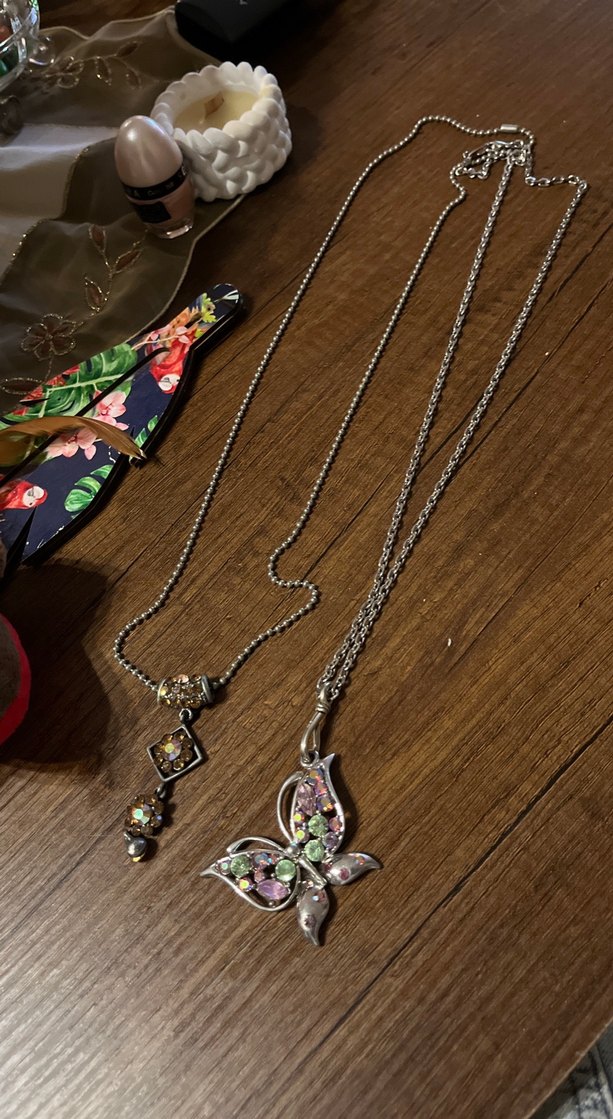 Uzun zincirli, renkli nakışlı kelebek ve geometrik figürlü kolye, bohem vintage tarzını yansıtır ve günlük kullanıma uygundur.
