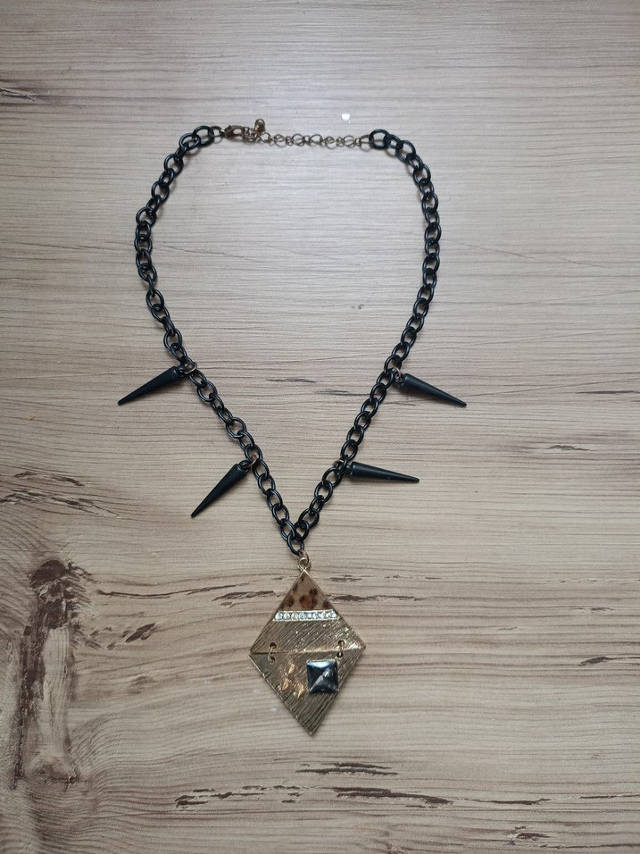 Uzun zincirli, siyah spike detaylı ve altın yılan desenli kolye, rock punk havası sunar.