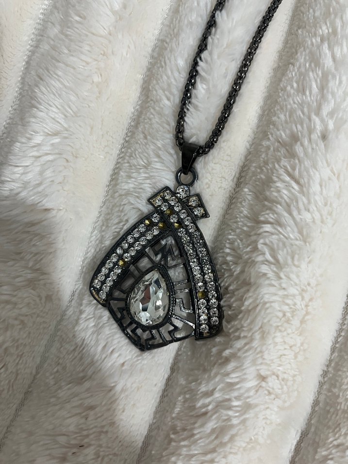 Uzun uzun zincirli, işlemeli taşlı gotik tarzda kadın kolye. Beyaz ve gri tonlarda, kürk dokulu zeminde asılı.