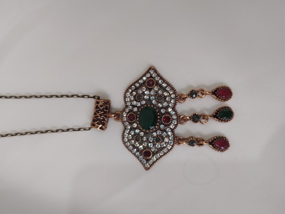 Uzun zincirli, detaylı zincir ve koyu turkuaz ile kırmızı taşlı desenli bohem kolye. Günlük kullanım için uygundur.