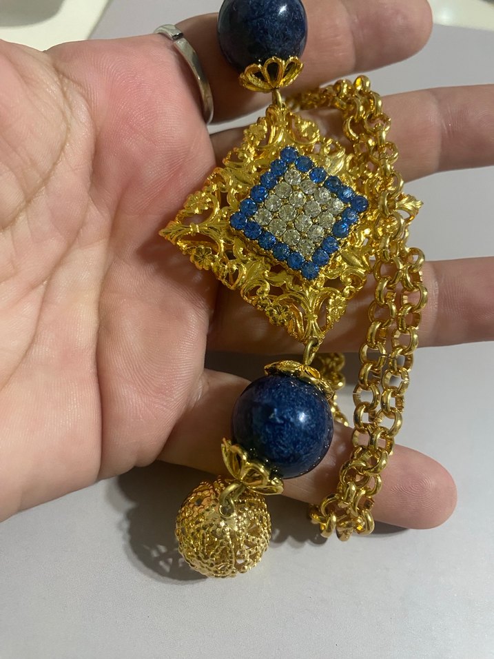 Uzun uzun zincirli, mavi ve parlak taş detaylı desenli altın renkli vintage bohem kolye. #Almanya #vintage