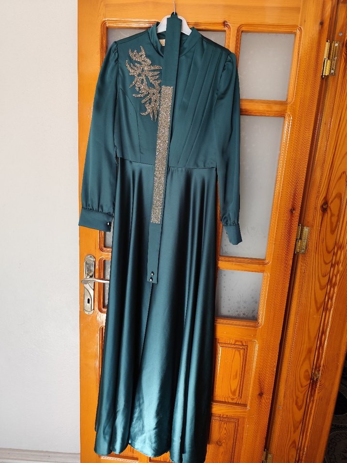 Uzun Zümrüt Yeşili Nakışlı Kadın Abiye Elbise Şal+200 Tl