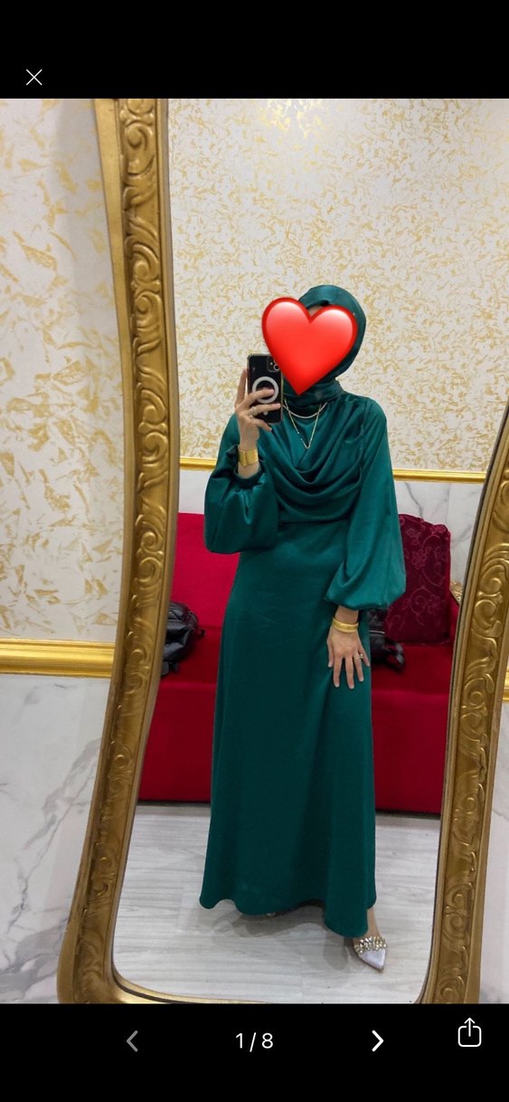Yüksek yakalı, uzun kollu ve drapeli önüyle oturan uzun elbise. Satenimsi kumaştan, zümrüt yeşili renkte bir kere kullanıldı. Janjan şalı ile birlikte gönderilecektir. Marka temsili.