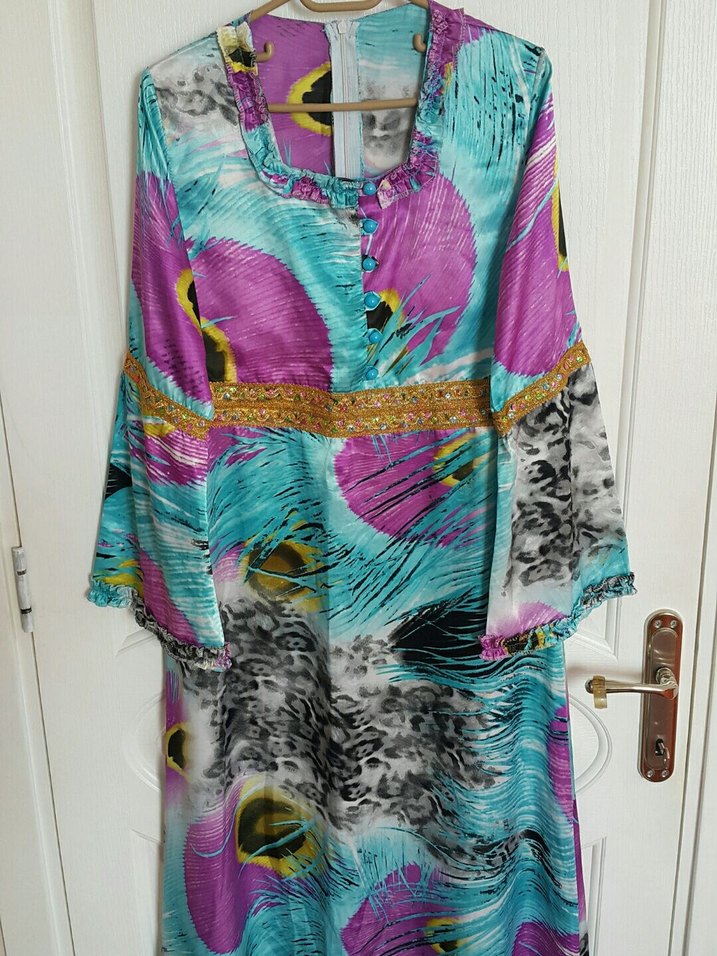 Hiç giyilmedi. Yumuşak sentetik kumaştan, etek kısmı çan inen, çok şık bir elbise.