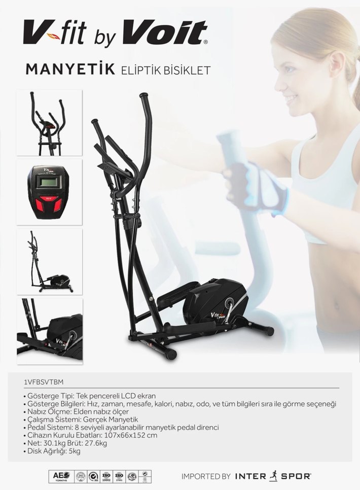 V-fit by Voit manyetik eliptik bisiklet, gerçek manyetik pedal direnci ve tek pencereli LCD ekran ile zaman, mesafe, kalori, nabız gibi bilgileri gösterir. Ağırlığı 27,6 kg'dır. Bir hevesle aldık , birkaç kez kullandık ve bir kenara koyduk duruyor. İhtiyaç fazlası olduğu için satılıktır.