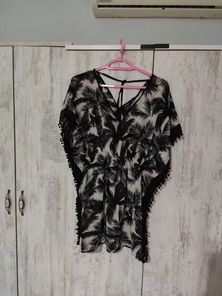 V yakalı, askılı kollu siyah bohem detaylı ve koyu batik desenli. Sentetik kumaştan, bol kesim.