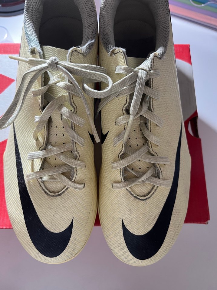 Beyaz erkek futbol ayakkabısı, velcro ve bağcıklı, çağdaş tasarımlı, spor için kauçuk tabanlıdır. 37NUMARADIR