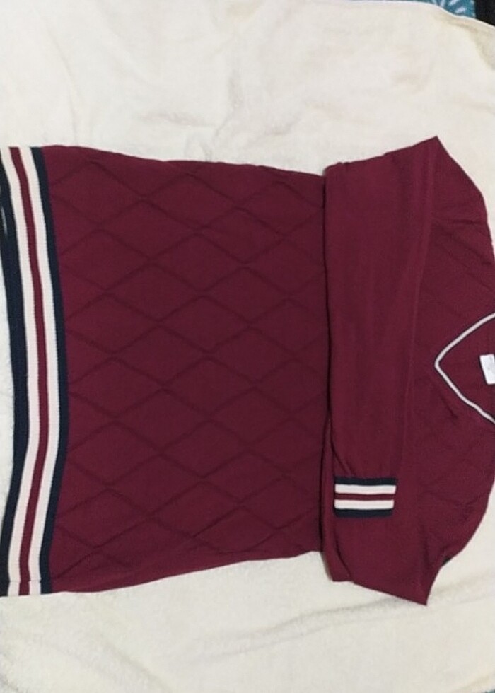 İçinde krem bordo lacivert çizgileri olan v yaka kazak