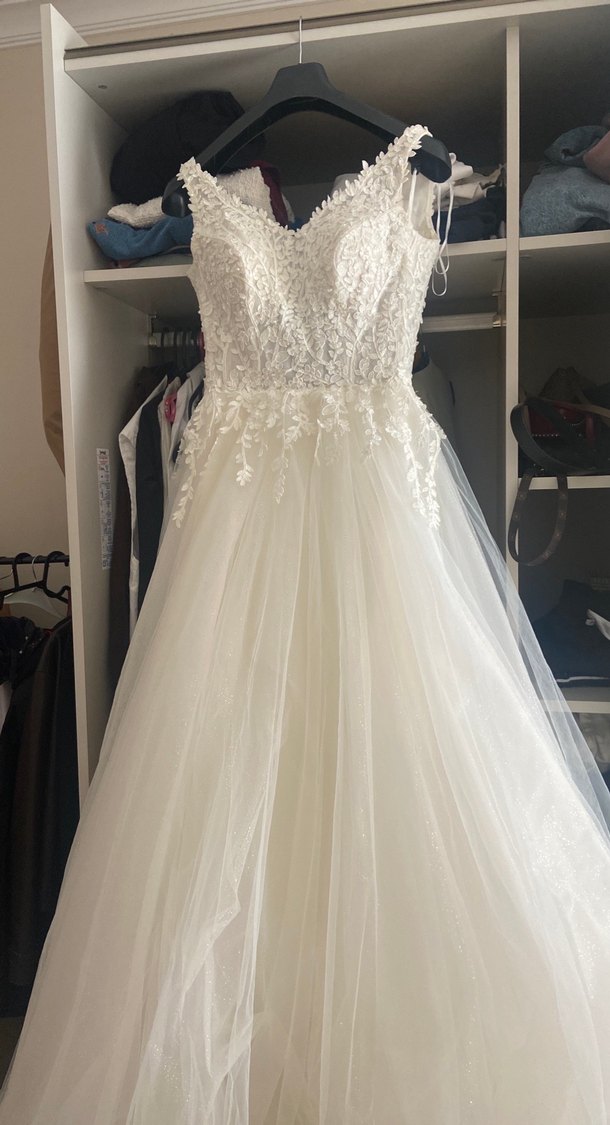V yakalı ve askılı kollu, fitted kesim A-line gelinlik, şık tarzda. Eteği simli üzeri çiçek dal dantelli. Deformesiz. Tarlatanı ve duvağı ile gönderilecek. Seher Gelinlik özel dikim gelinlik. Taşınacağım için uygun veriyorum, hemen kargo