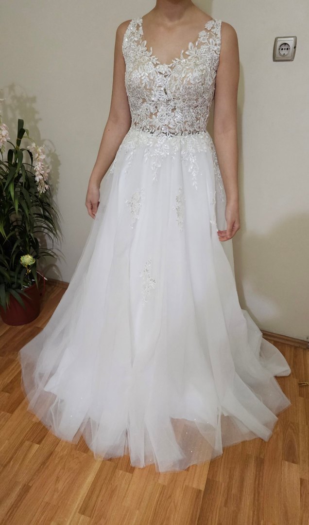 Dantel detaylı, V yakalı, kolsuz, uzun beyaz gelinlik. A kesim etek ile klasik ve zarif bir görünüm sunar.
