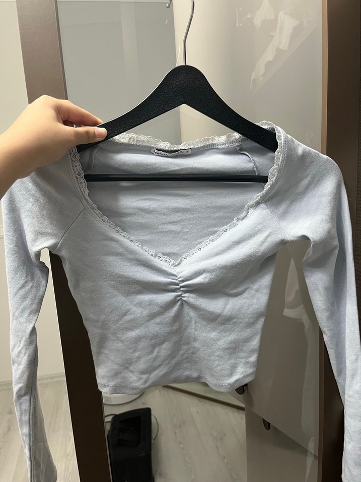 Bu kadın bluz, V yaka ve uzun kollu, vücuda oturan kesime sahiptir. Yumuşak kumaştan yapılmış, açık mavi renkte gündelik sokak stili için uygundur.