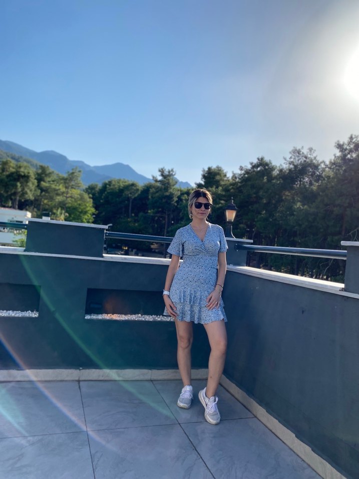 Mavi tie-dye desenli, V yakalı , çiçekli hem zarif hem rahat şıklık sunar. Alt üst 2 li takımdır . S-M bedene uyumlu esnektir .