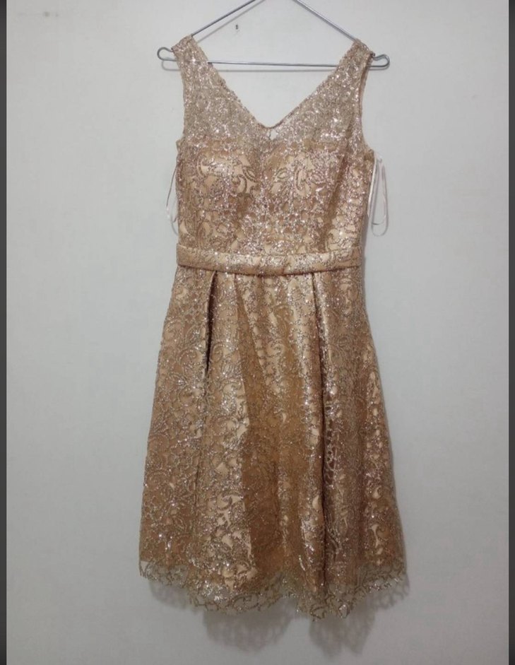 V yaka altın sarısı işlemeli simli astarlı pileli kısa abiye elbise