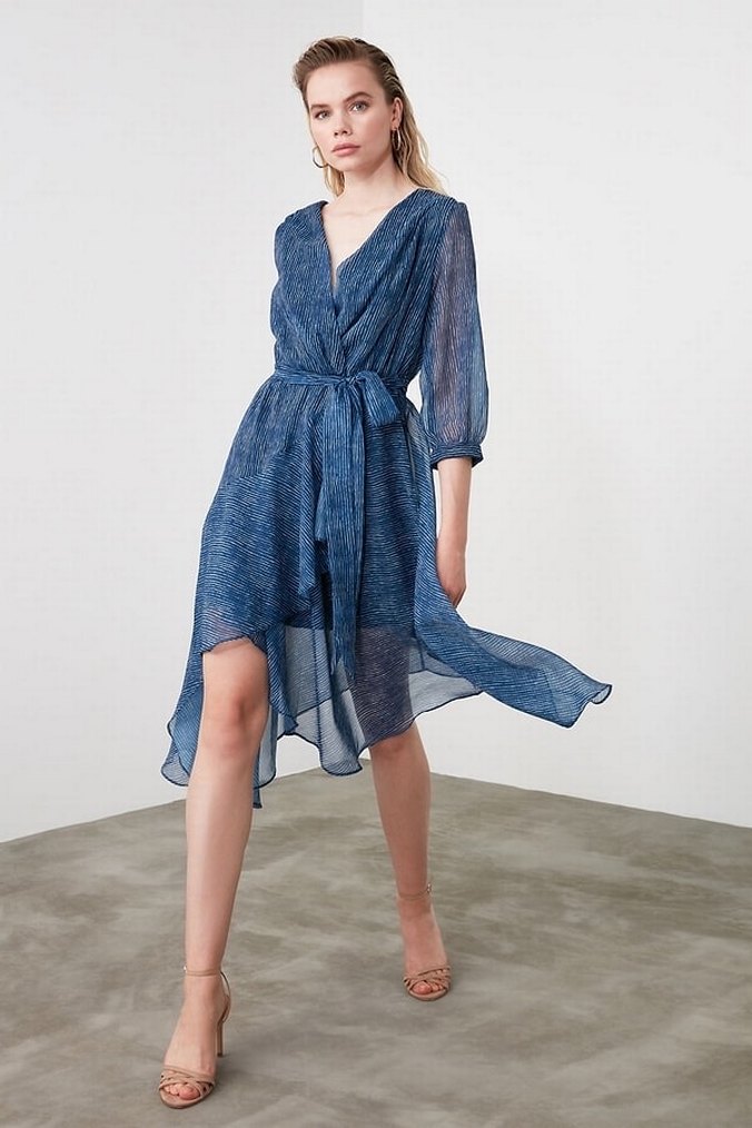 V Yaka Asimetrik Mini Lacivert Elbise