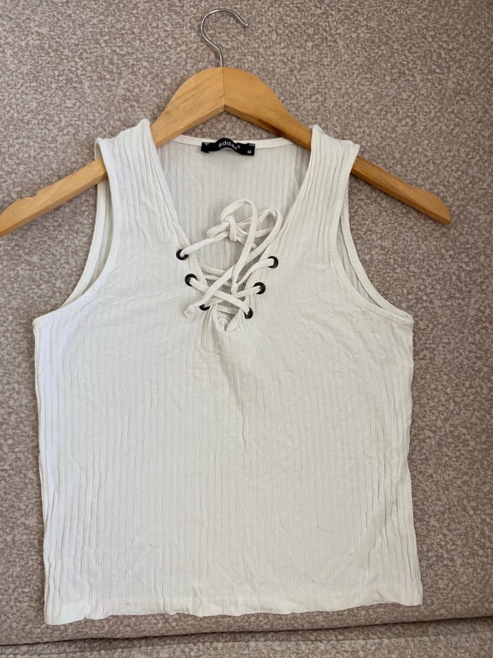 Yumuşak keten kumaştan, V yaka ve bağcıklı detaylı, kolsuz ve vücuda oturan beyaz kadın atlet.